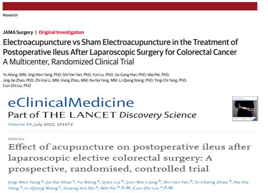 刘存志教授团队通过两项随机对照试验,首次在加速康复外科路径下,证实了针刺下合穴、募穴等特定穴能够显著促进腹腔镜结直肠癌切除术患者的术后胃肠功能恢复,为针灸治疗术后肠麻痹及其腧穴配伍方案的制定提供了循证医学证据。该系列研究成果拓展了针灸的临床应用范围,有助于促进针灸融入现代外科多学科交叉协作模式,为推动中西医有机结合提供了可行的思路。相关学术论文在2022年分别于JAMA Surgery和EClinicalMedicine发表。